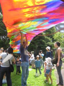 ライフワークとして大人から子供まで大勢の人たちと長い布を野外で染める「野染め」活動を各地で行っている。