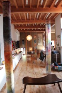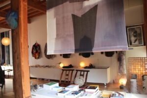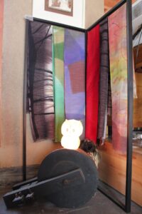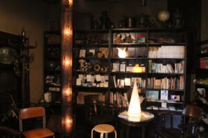 後ろの棚にあるものは、二体の兎灯(和灯屋作)を除いて、すべてU空間の常時展示物。
